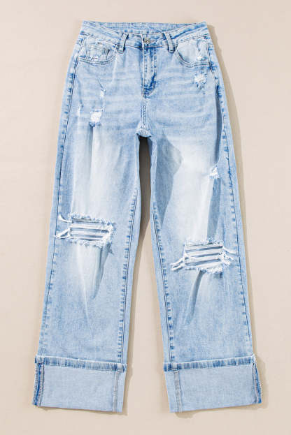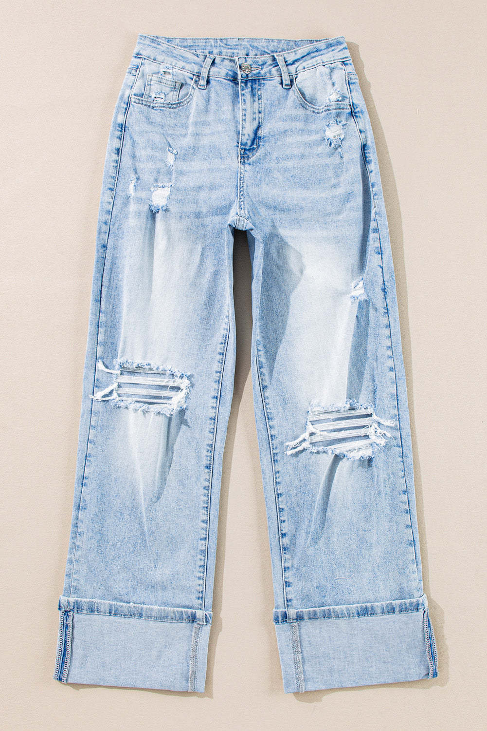 • Experience vintage style with our distressed jeans in a light wash.