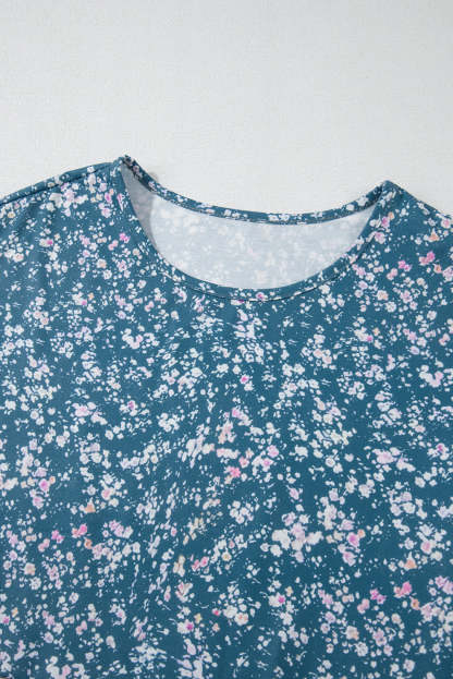 Orange Floral Color Block Ruffled Hem Round Neck Blouse
