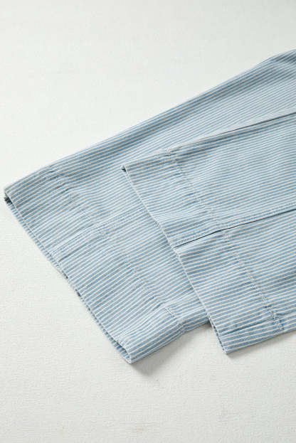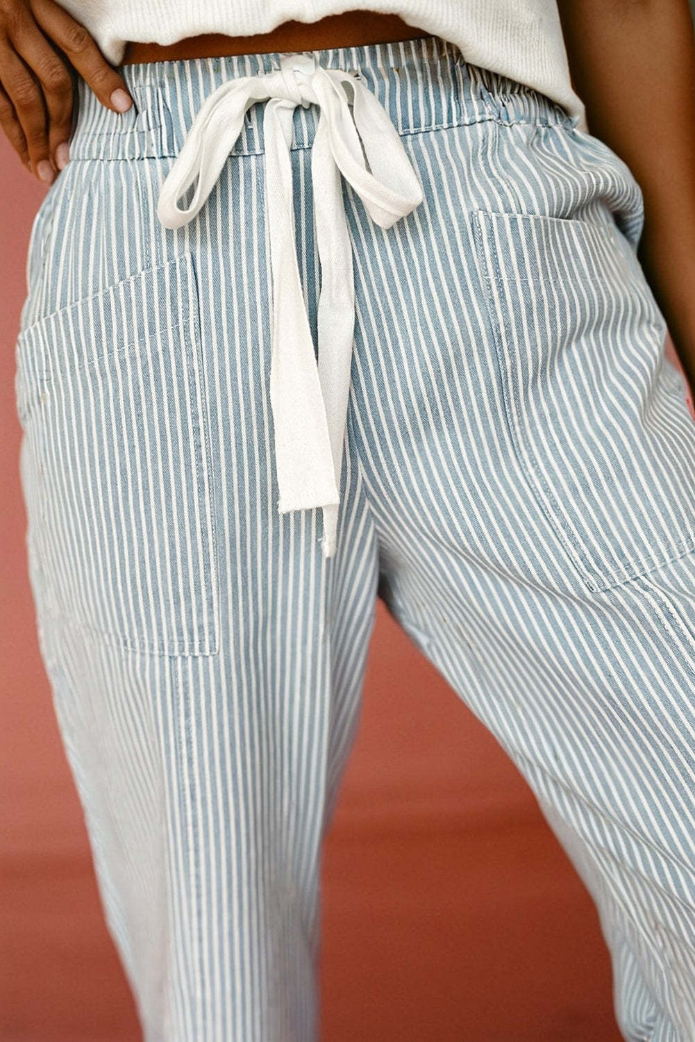Sky Blue Stripe Mid Rise Drawstring Waist Jeans